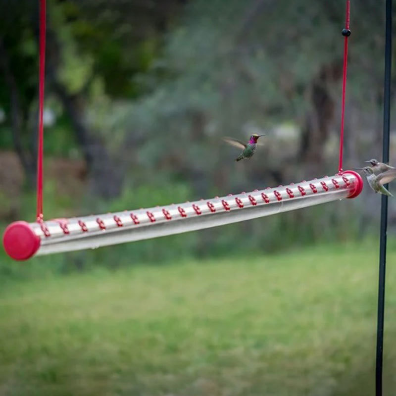 Attract more hummingbirds to your yard with just one feeder thanks to the unique design of this Bob's hummingbird feeder. The feeder provides a long, flute-like shape that hangs horizontally, providing hummingbirds access to its flower-shaped feeding ports.