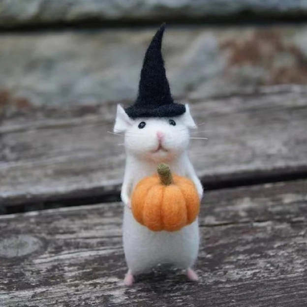 Needle felted Halloween mouse with black Halloween hat holding a pumpkin. The pumpkin is movable.