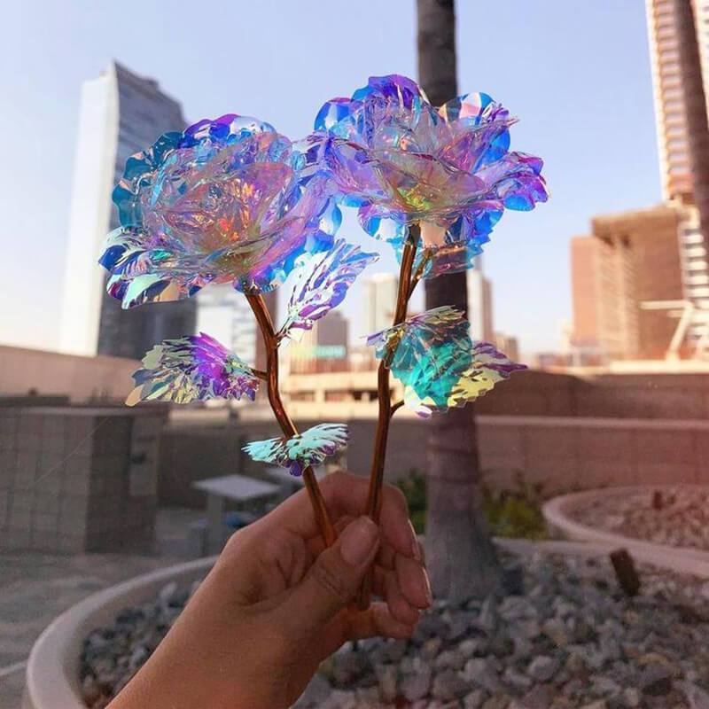 Finally, we cover them in an iridescent holographic coating to make the rose PET stem and PET petals sparkle in the light. Then we hand place each iridescent holographic coated petal which makes the roses look so eye-catching!